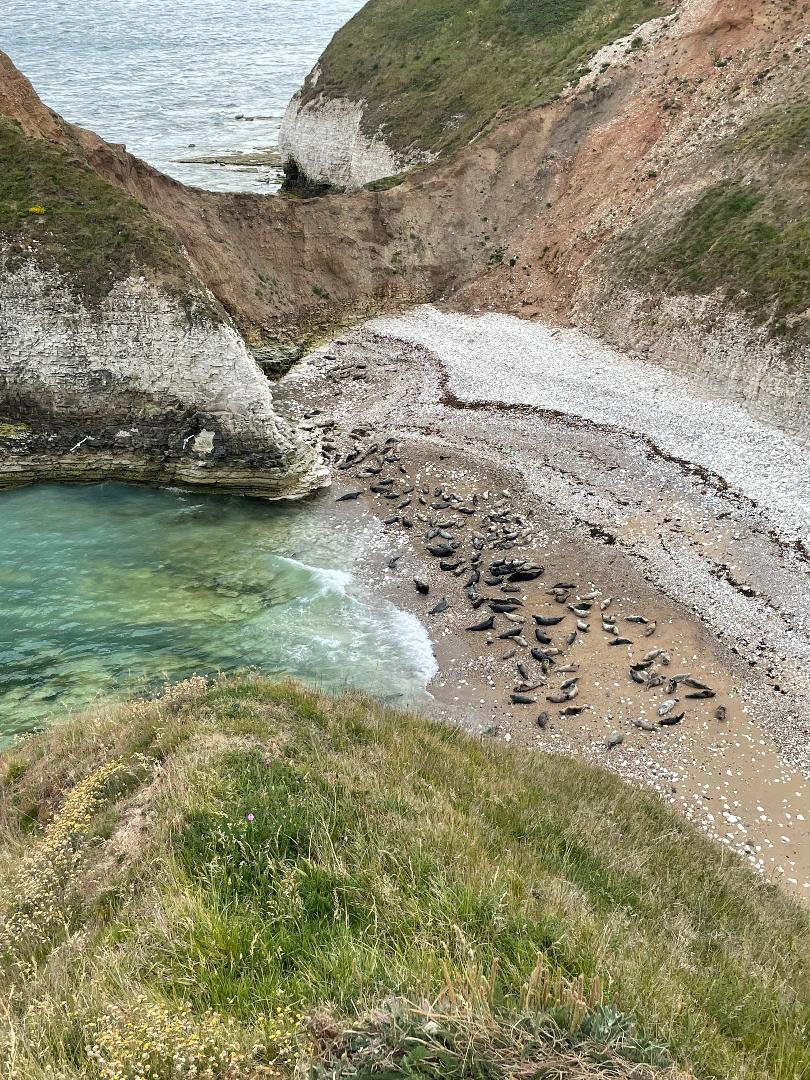 The moment we arrived, we were greeted by breath taking views: turquoise waters shimmering in the sunlight, dramatic white chalk cliffs rising from the sea, and the sound of waves echoing in the coves below. Down in the shallows, we spotted seal pups bobbing and playing in the water – their little heads popping up like curious swimmers. It felt like nature’s own theatre.